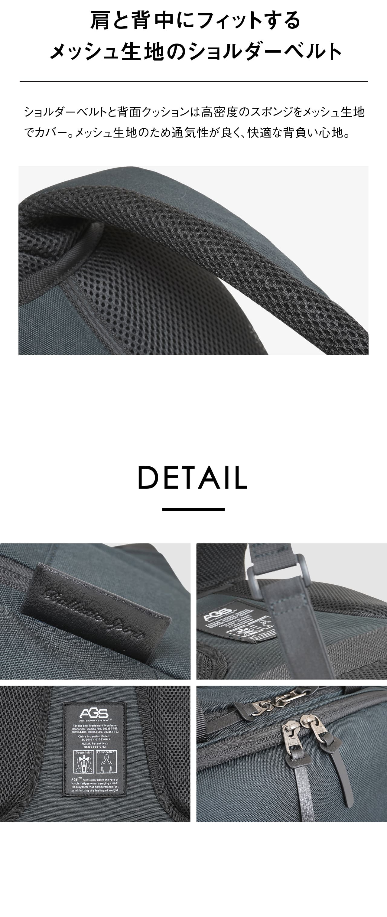 AGSリュックの特徴的なポイントは、無重力リュックとも呼ばれるサスペンション。背面にゼログラビティフィットを採用し、荷物の重さを感じさせず、長時間でも快適な持ち運びが可能です。さらに、PCリュックとしても機能し、2つのルームで荷物を整理できます。
