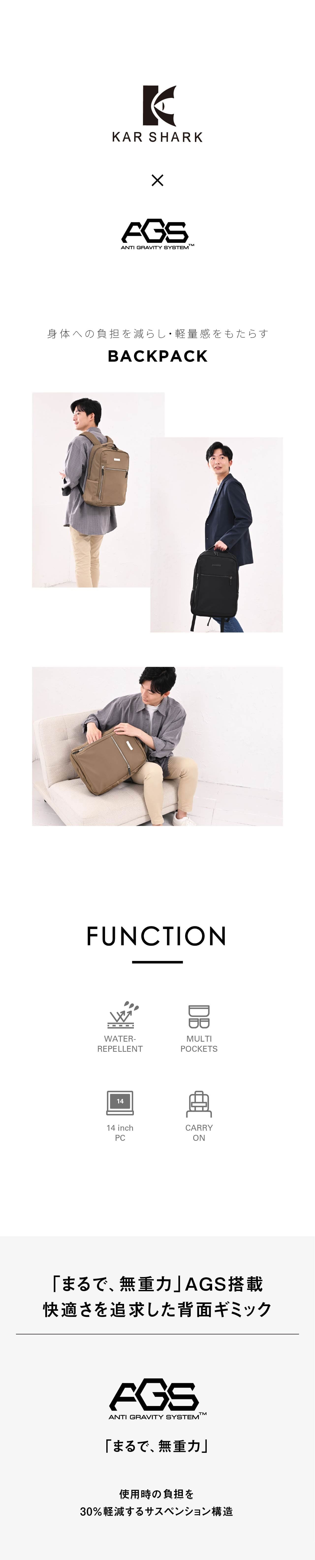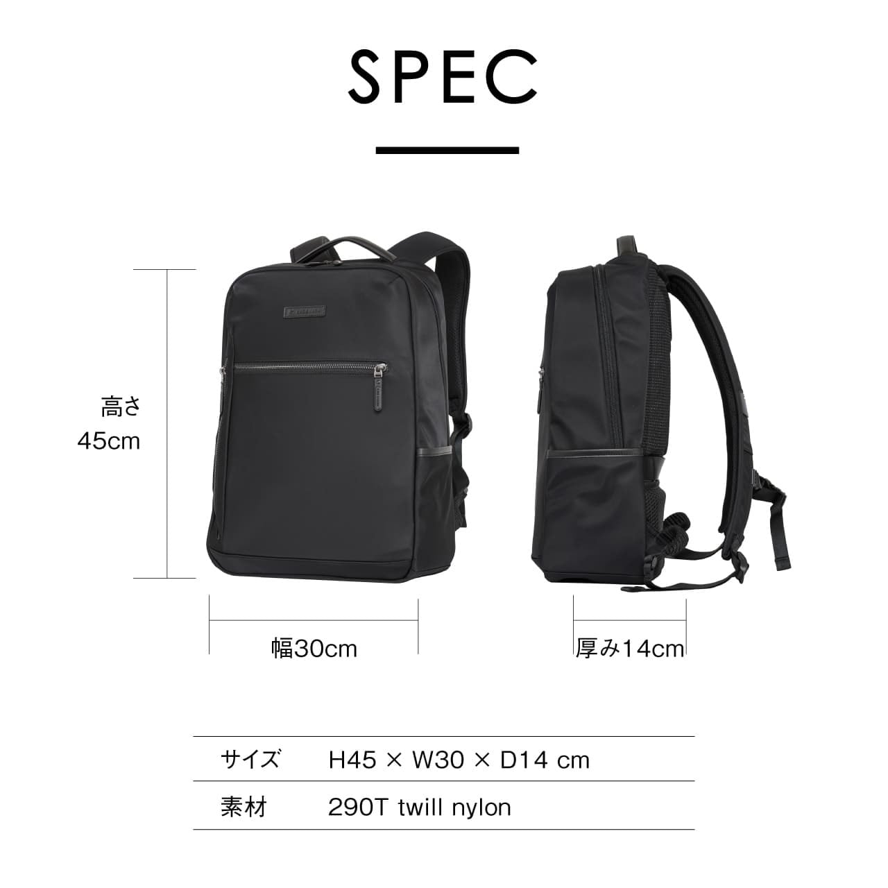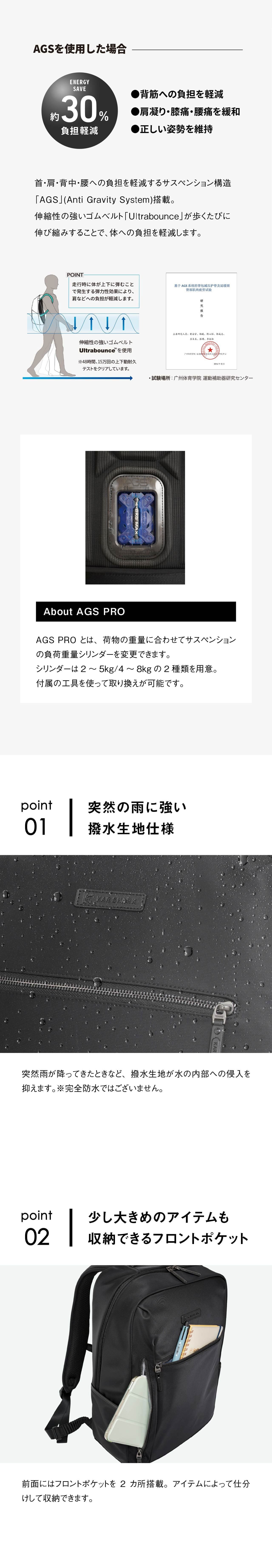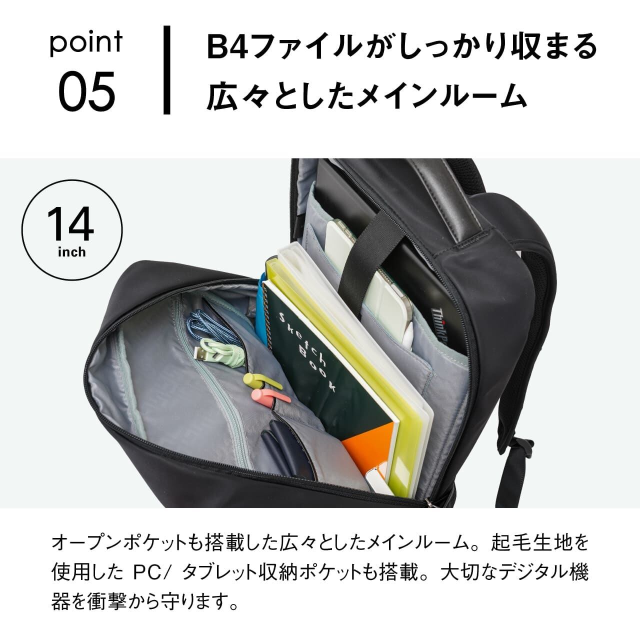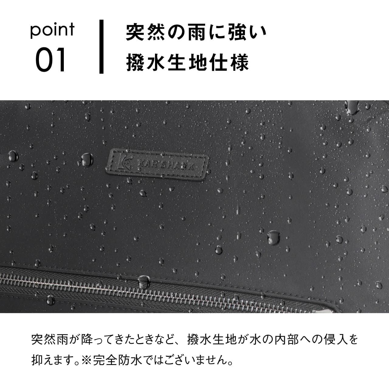 《製品の特長》 ・突然の雨に強い撥水生地仕様 ・少し大きめのアイテムも収納できるフロントポケット ・サッと取り出せる便利なサイドポケット ・外から見えず安全性の高い背面隠しポケット ・B4ファイルがしっかり収まる広々としたメインルーム(14インチPC対応) ・負担を分散しズレを防ぐ可動式チェストベルト装備 ・スーツケースに固定できるキャリーオンベルト装備