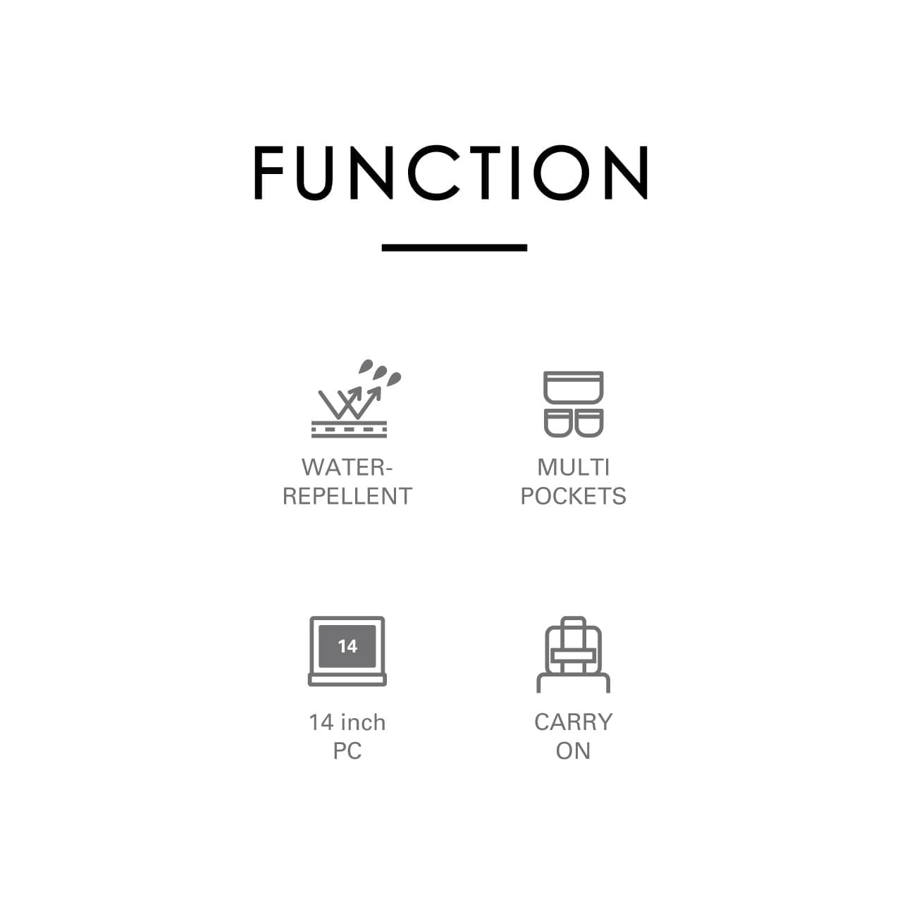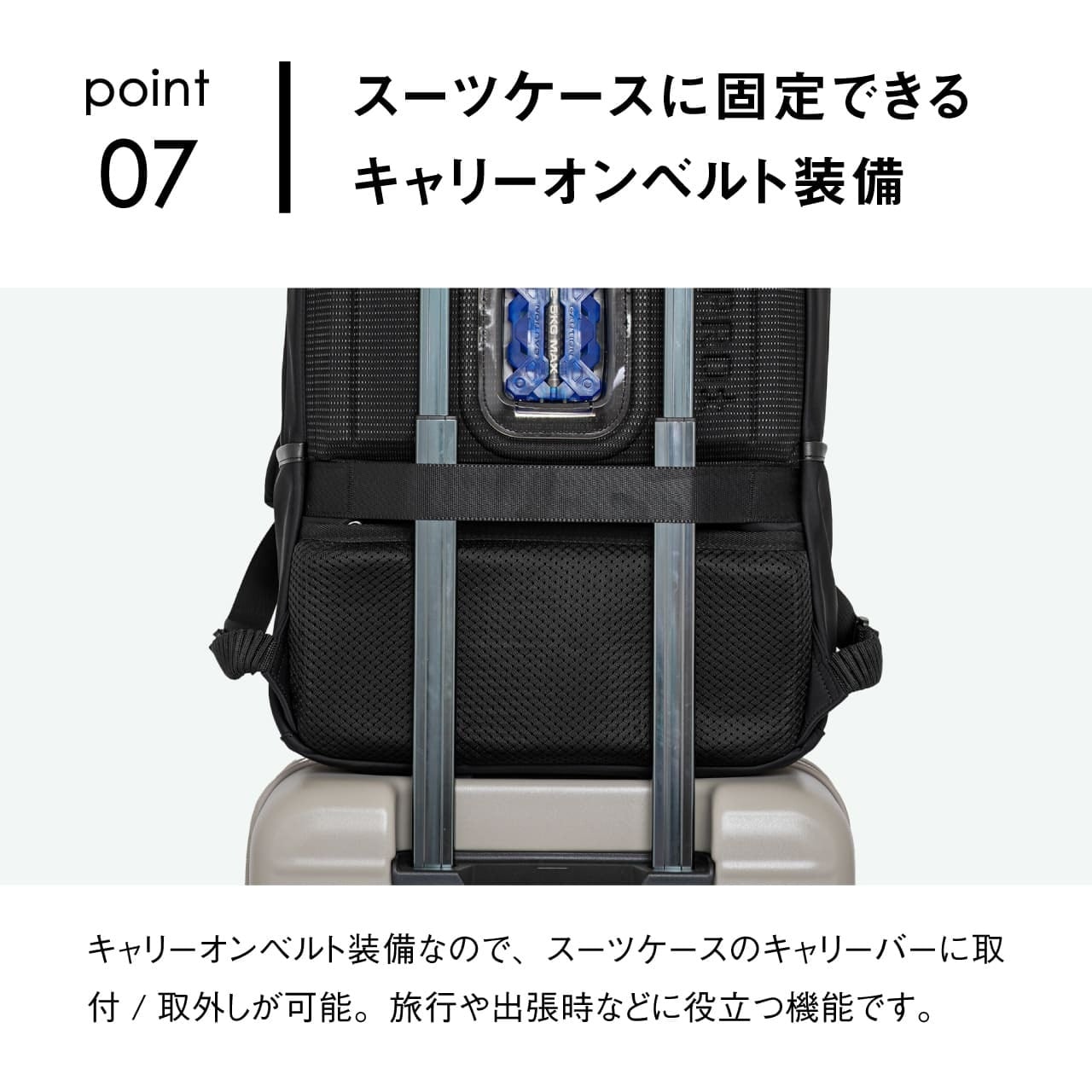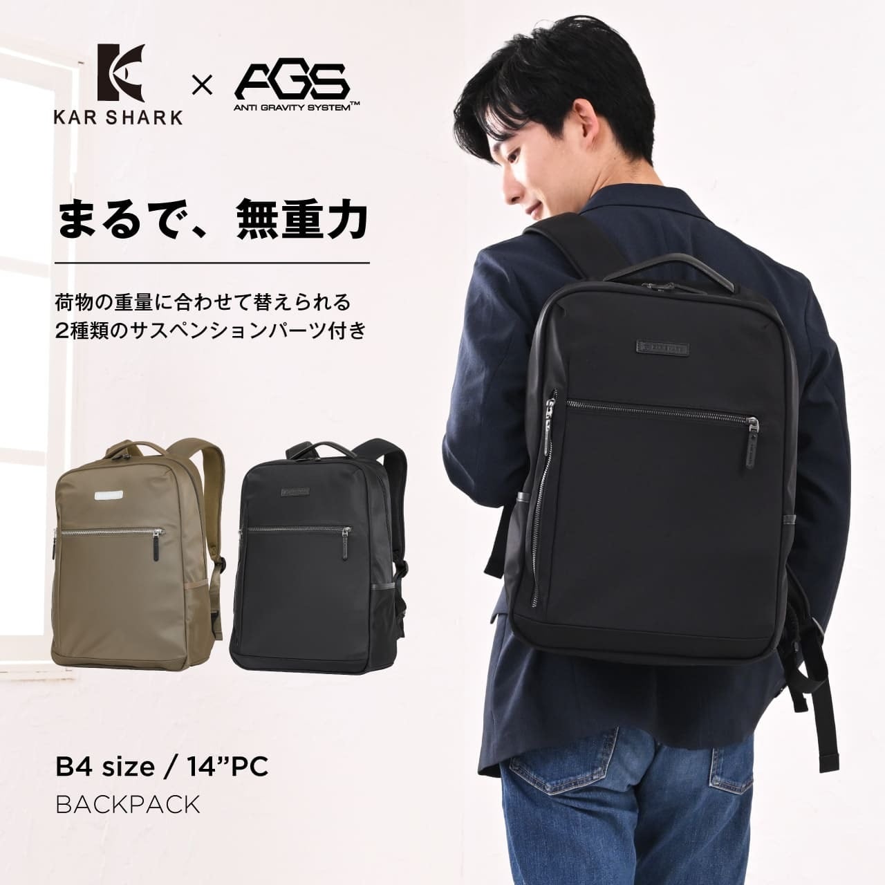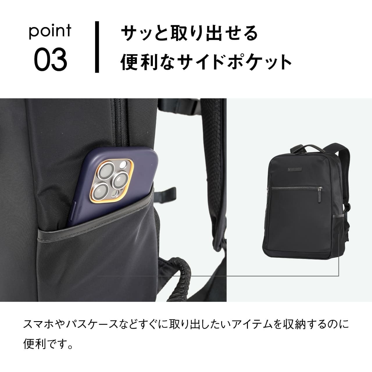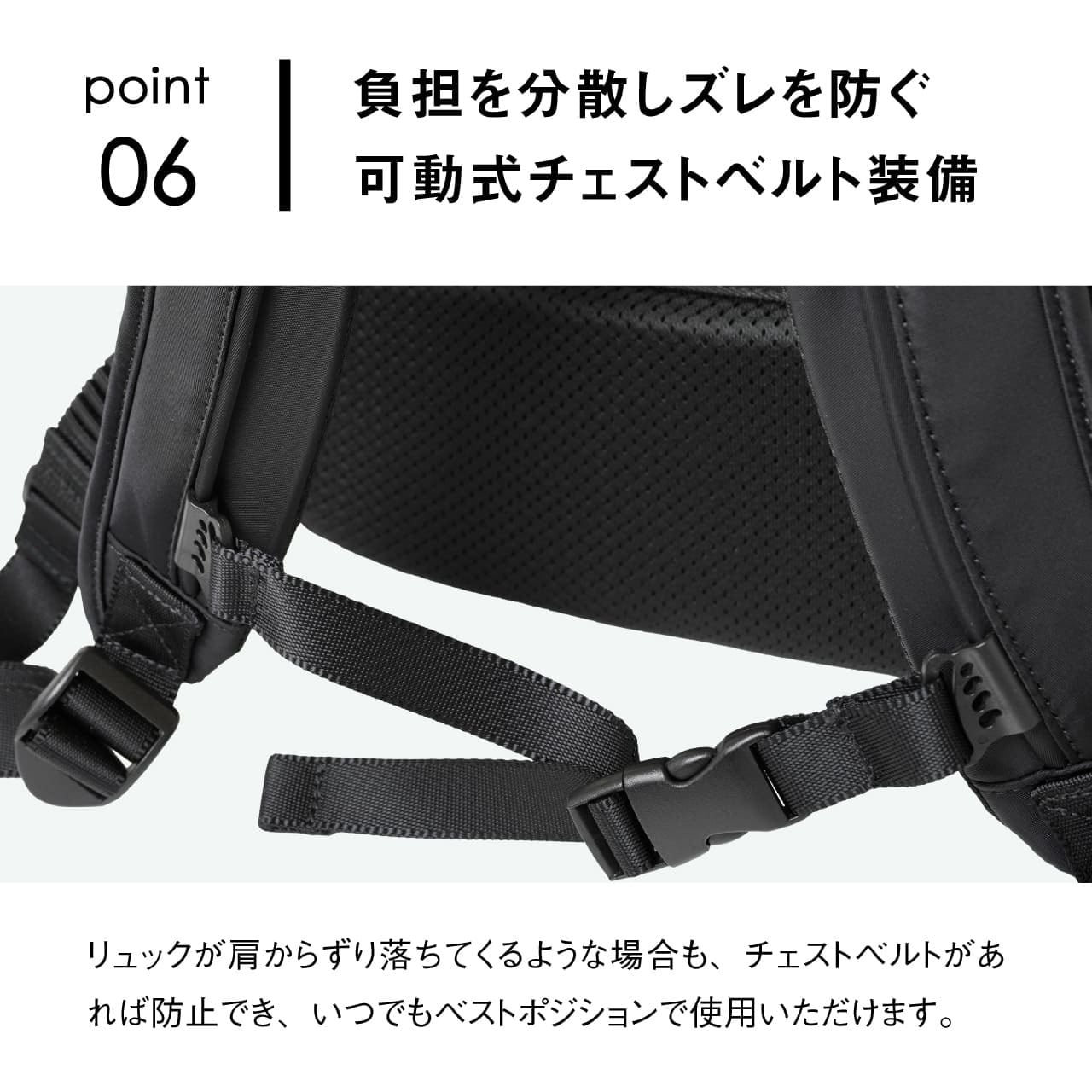 《製品の特長》 ・突然の雨に強い撥水生地仕様 ・少し大きめのアイテムも収納できるフロントポケット ・サッと取り出せる便利なサイドポケット ・外から見えず安全性の高い背面隠しポケット ・B4ファイルがしっかり収まる広々としたメインルーム(14インチPC対応) ・負担を分散しズレを防ぐ可動式チェストベルト装備 ・スーツケースに固定できるキャリーオンベルト装備