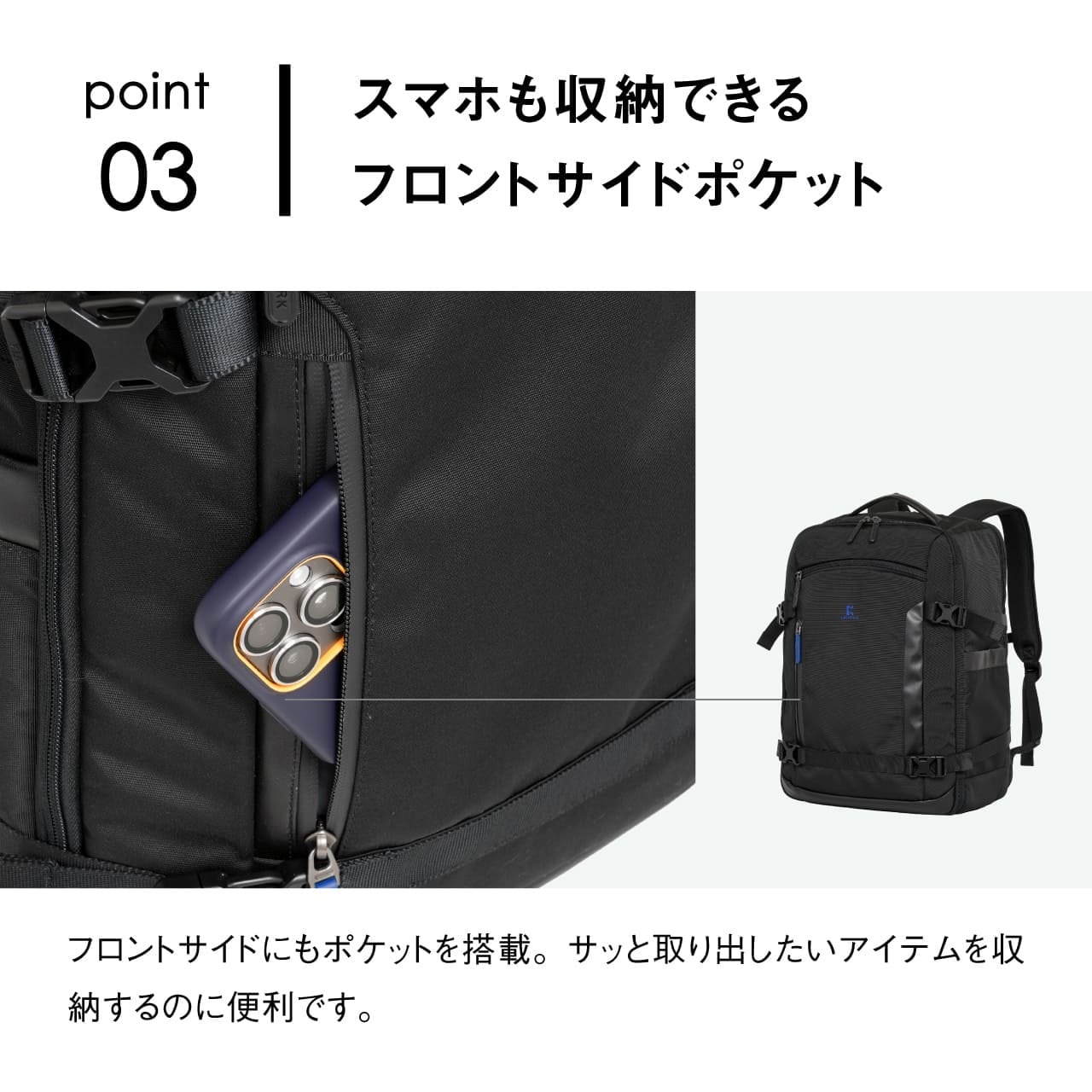 ・スマホも収納できるフロントサイドポケット
