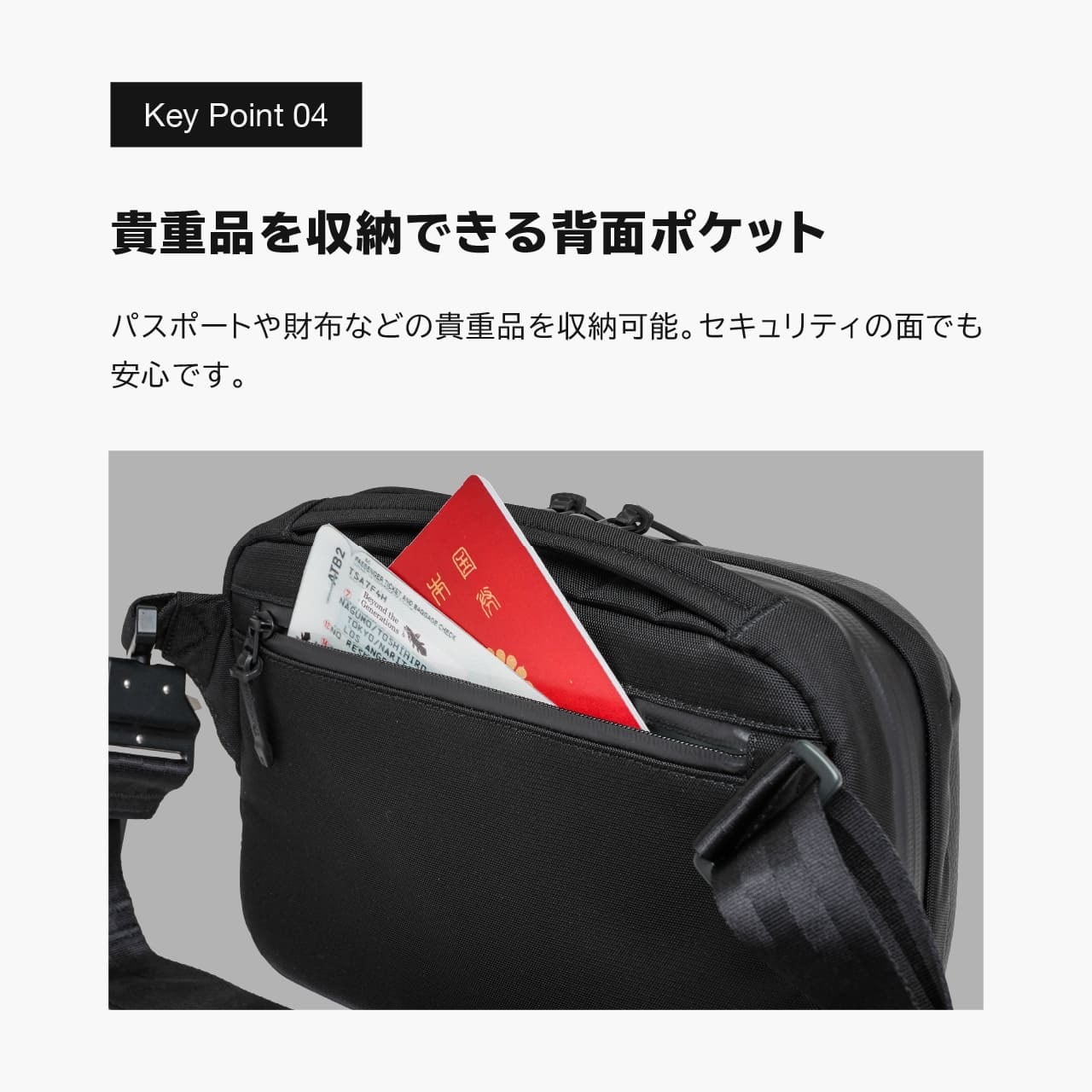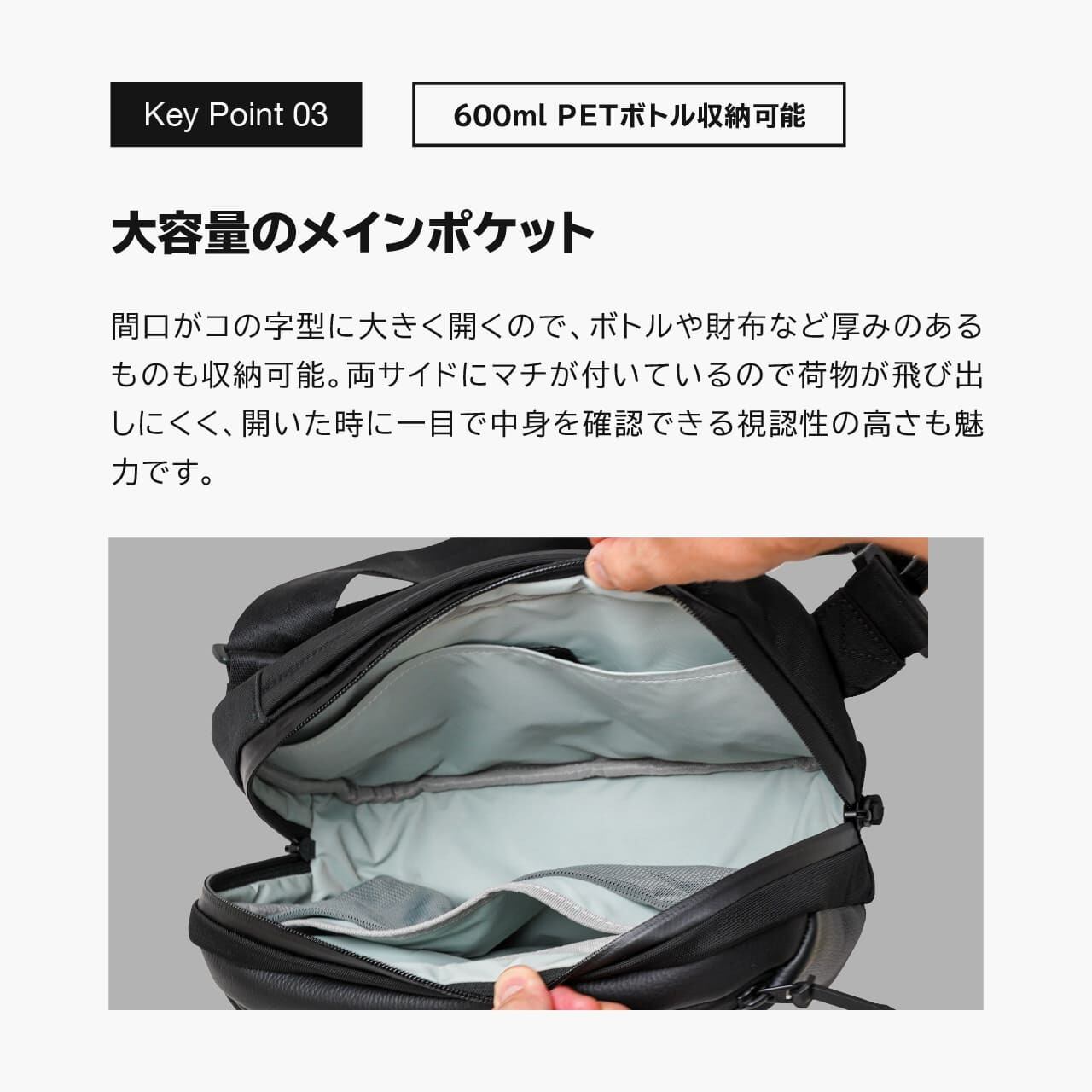《製品の特長》 ・実用的で高級感のあるデザイン ・仕分けができるフロントスリットポケット ・大容量のメインポケット ・貴重品を収納できる背面ポケット ・外れにくく頑丈なアルミバックル ・肩への負担を軽減する幅広ショルダー ・身体にフィットするコンパクト設計 ・軽量だから身軽に自由に動ける(550g)