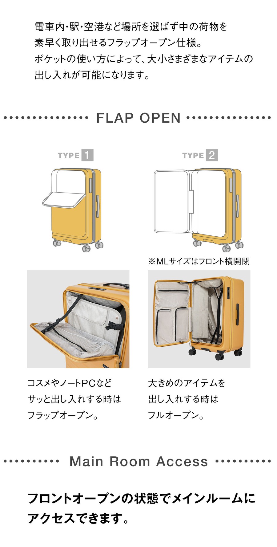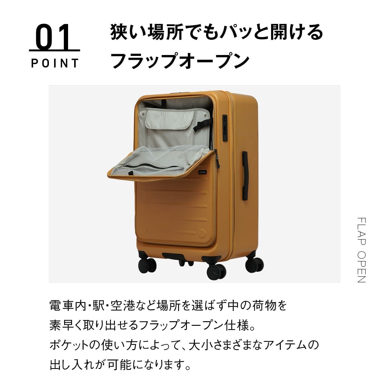 ・狭い場所でもパッと開けるフラップオープン