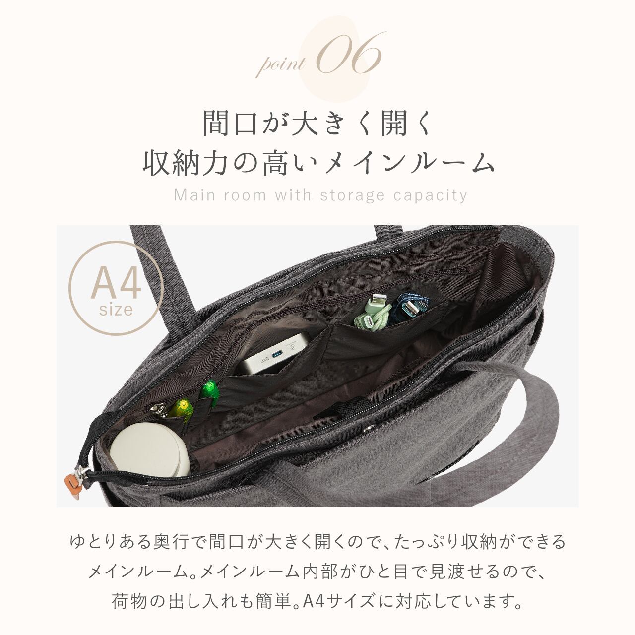 ・間口が大きく開く収納力の高いメインルーム(A4サイズ対応)