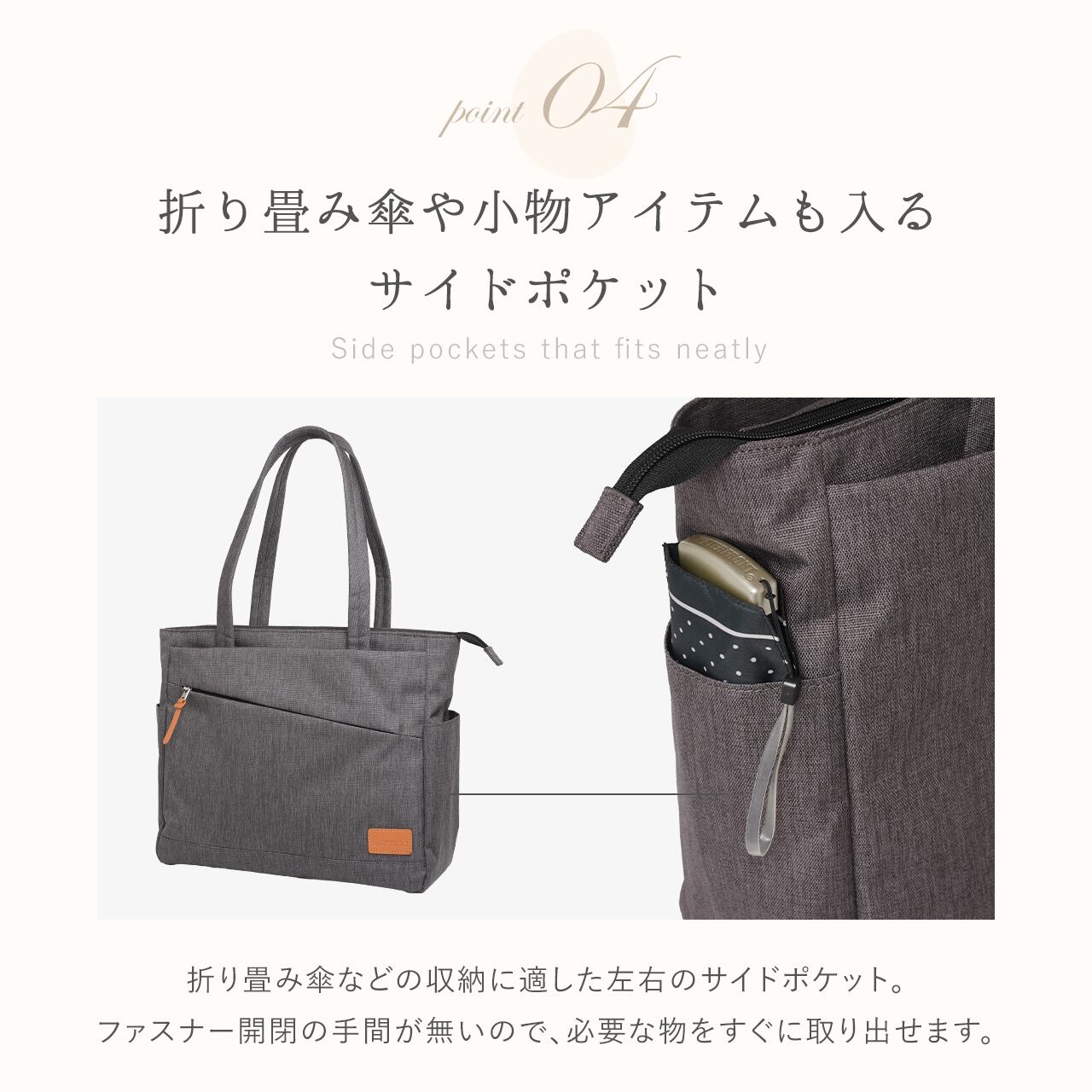 ・折り畳み傘や小物アイテムも入るサイドポケット