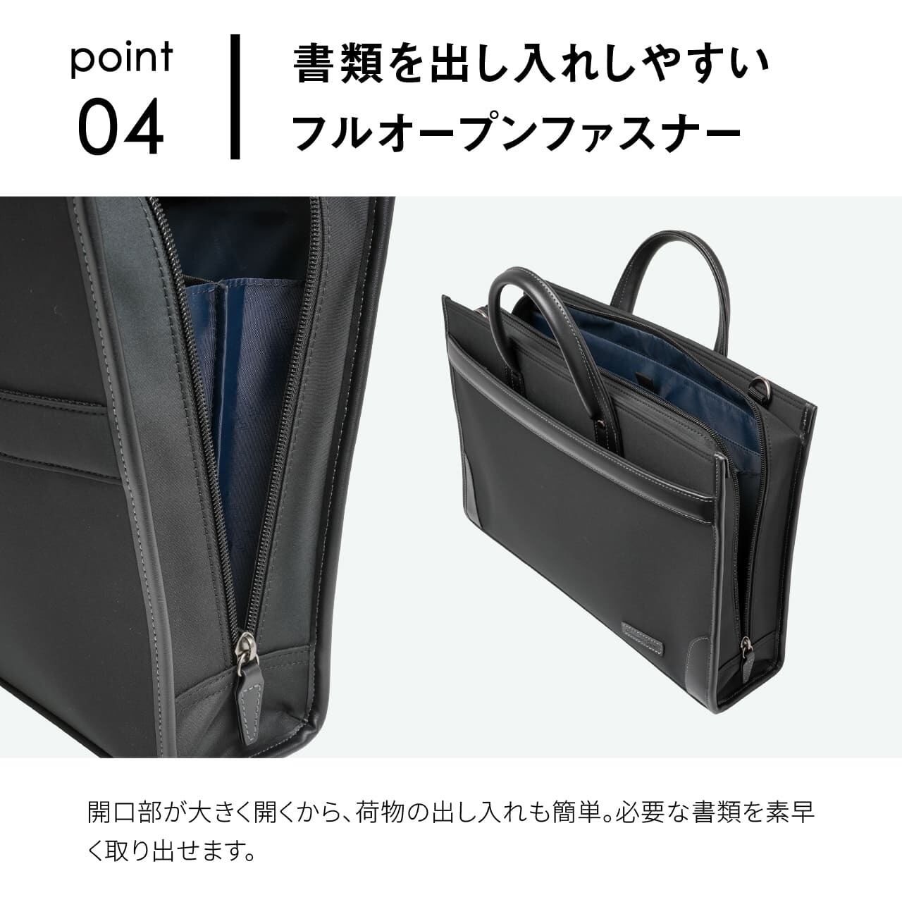 ・書類を出し入れしやすいフルオープンファスナー