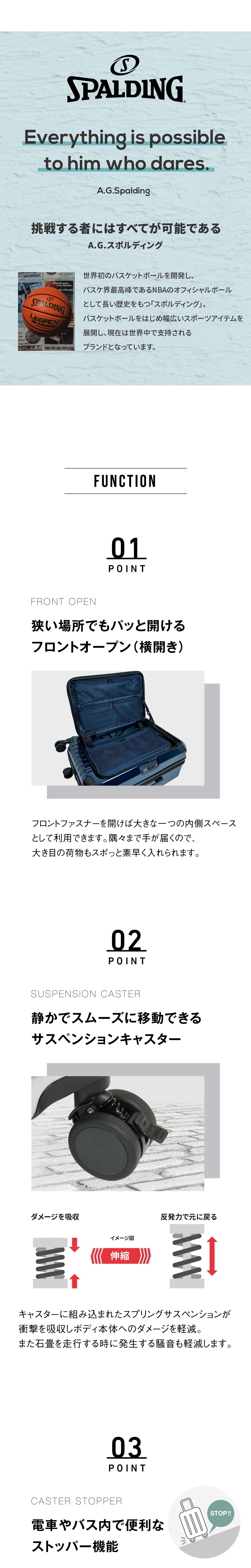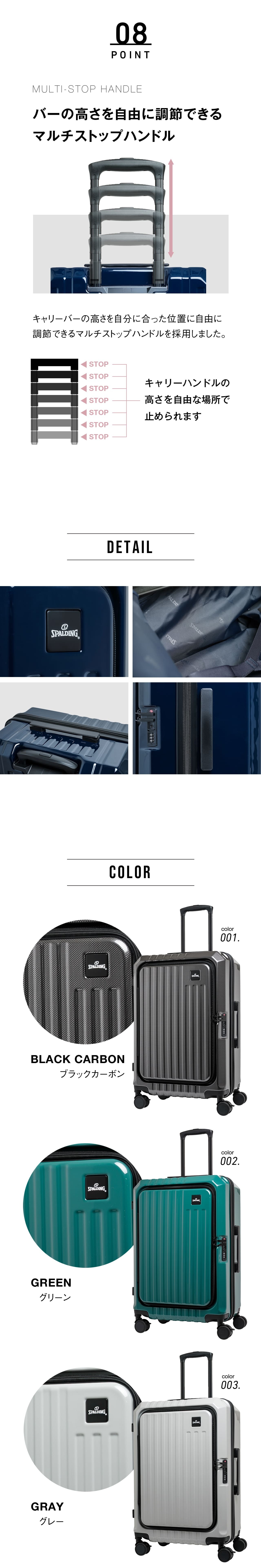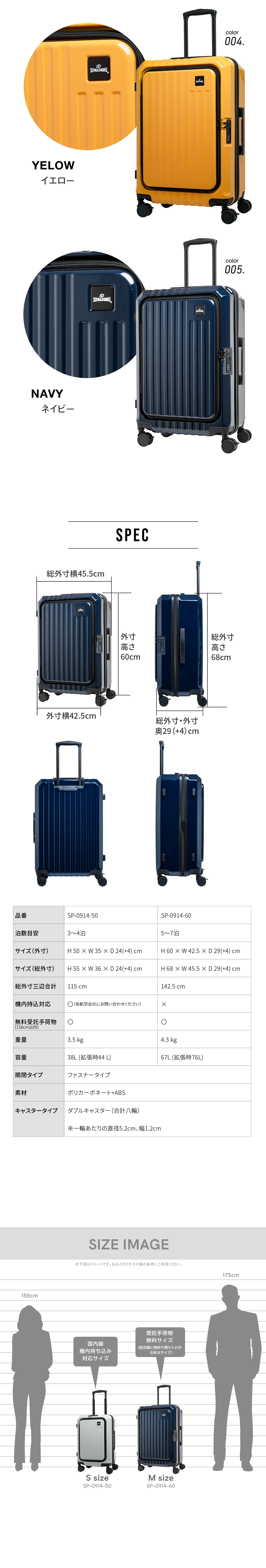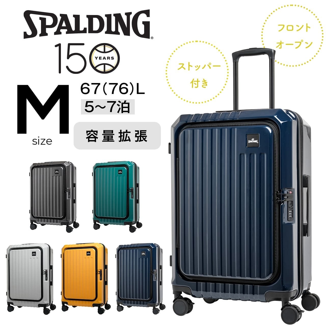 SPALDING スポルディング スーツケース Mサイズ フロントオープン ストッパー付き キャリーケース キャリーバッグ 拡張機能付き 67L (76L) 5泊~7泊 SP-0914-60