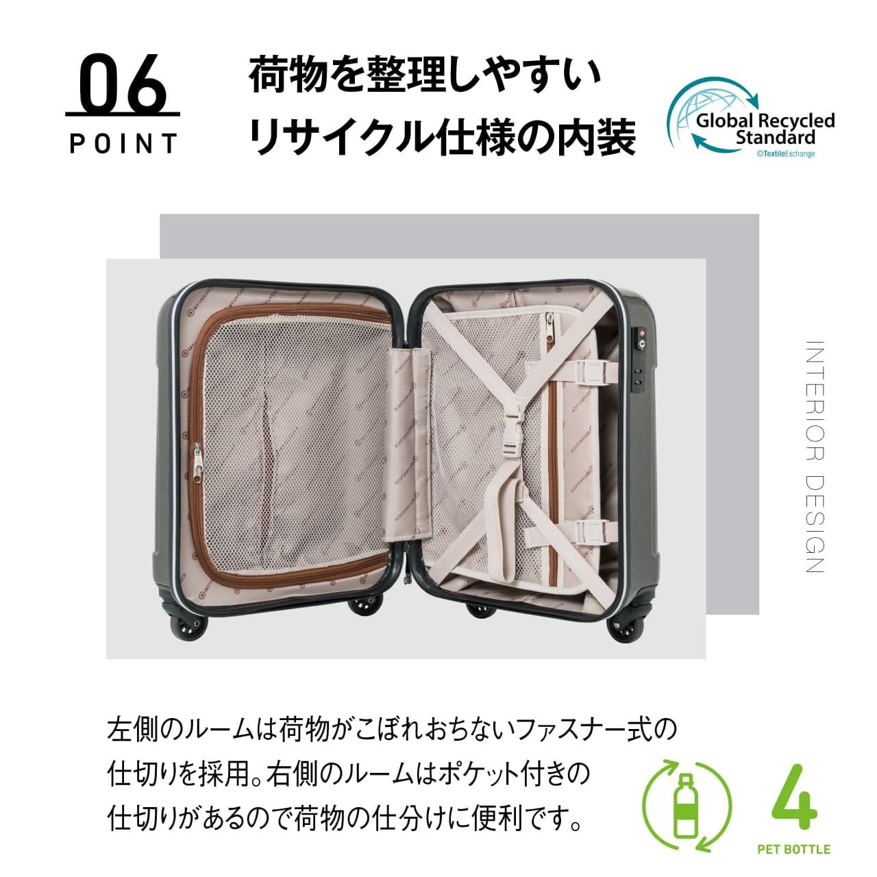 SSサイズでありながら25Lの収納力を誇り、コインロッカーにもぴったりなサイズです。軽量で丈夫なポリカーボネート素材を使用しており、頑丈さと軽さを兼ね備えています。360度回転する4つのキャスターと、取り外し可能なティーキーロック機能を搭載し、移動中も安心してお使いいただけます。